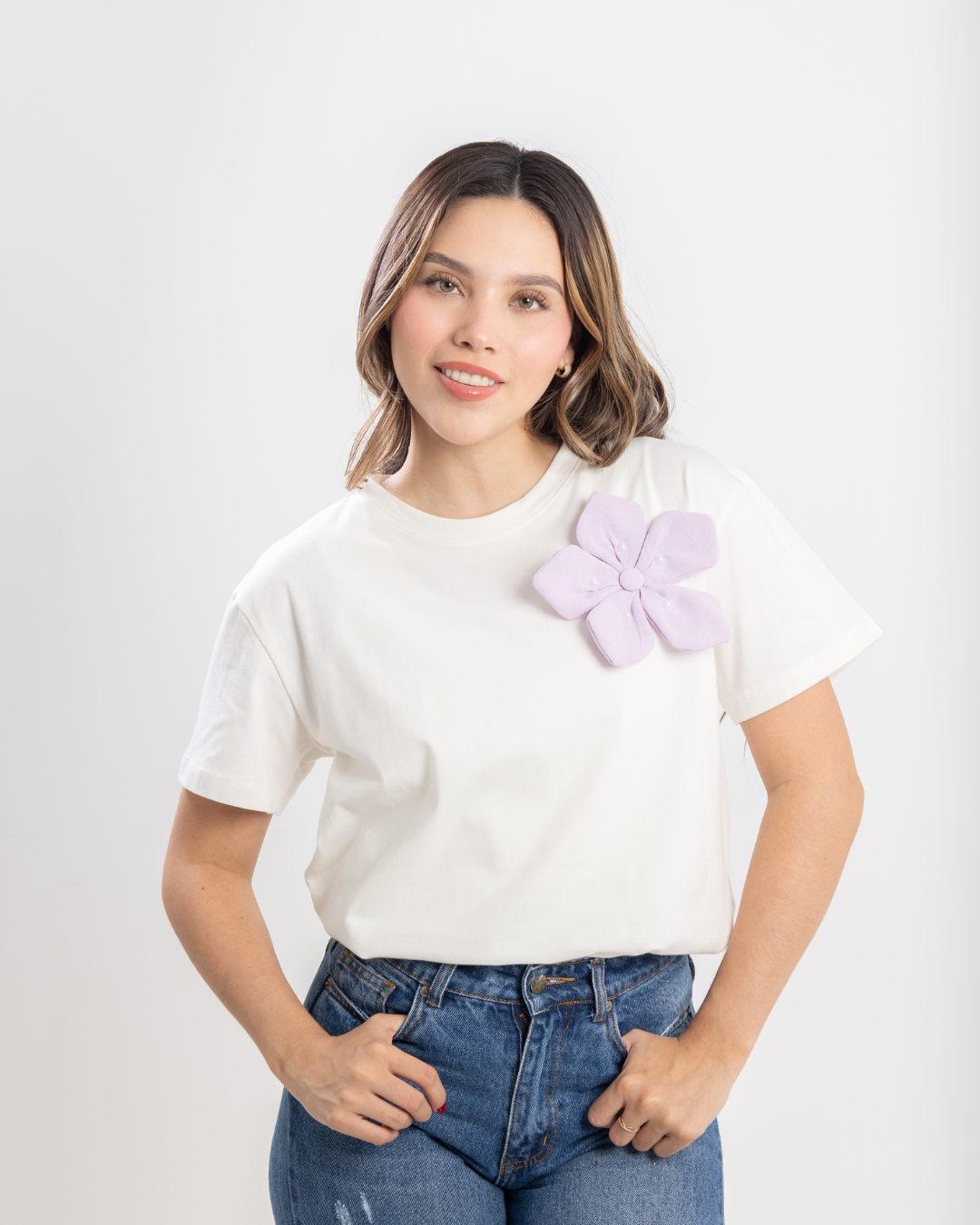 Camiseta color marfil de cuello redondo, manga corta y fit amplio, con flor color lila elaborada a mano, detalle de perlas en flor.