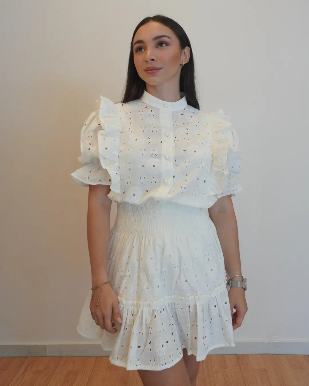 Set de blusa y falda ideal en estampado floral calado, delicado y femenino, ideal para lucir fresca, romántica y elegante en cualquier ocasión.